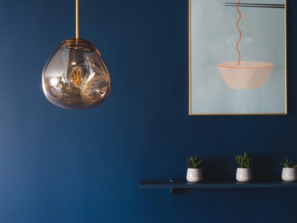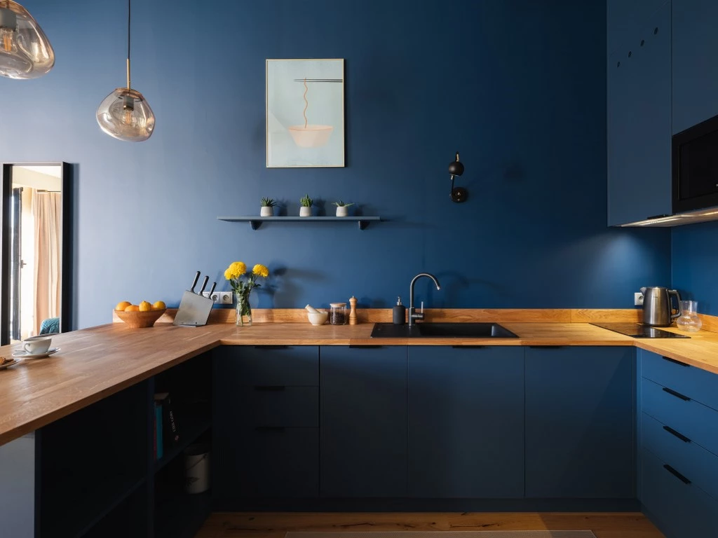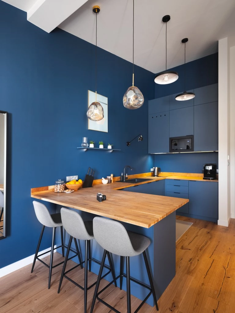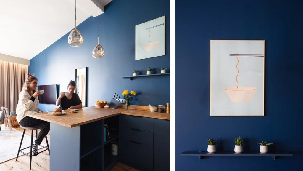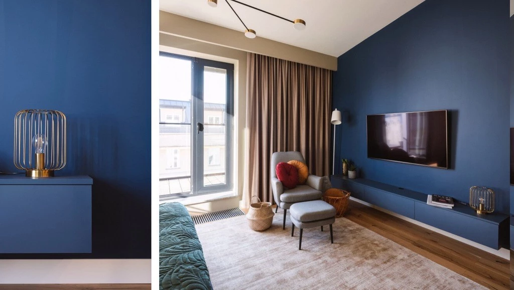 Rafał chciał by przestrzeń miała stylowy charakter, więc postawiłyśmy na mocny kontrast pomiędzy głębokim granatem oraz kremowym beżem.